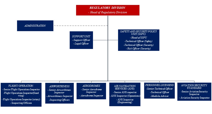 - Managing all elements of the Regulatory Division and to manage and faclitate of all aspects of aviation safety and security in a fully ICAO compliant.